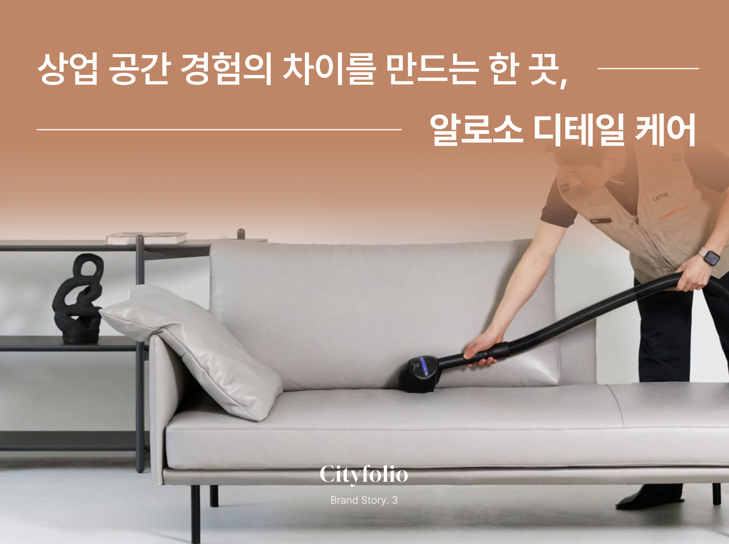 알로소는 이런 니즈를 파악하고 소파를 최적의 상태로 유지∙관리할 수 있는 디테일 케어 서비스를 제공합니다. 불특정 다수가 이용하고, 소유자가 없다고 할 수 있는 상업 공간의 소파를 최상의 상태로 오래 유지하도록 지원하는 서비스입니다. 유지 관리의 비용 절감과 방문객의 경험 품질 유지의 핵심 요소와 관련된 부분이기에 차별화된 서비스 제공에 더욱 집중합니다.
